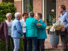 Sammelje by it Weidumer doarpshûs; Jellie, Sabine en Gjalt mei in skelter-karre fol lekkers, ús eardere Frijwilligers fan ’t Jier, de fotograaf en fanséls de oanbelangjende famylje.